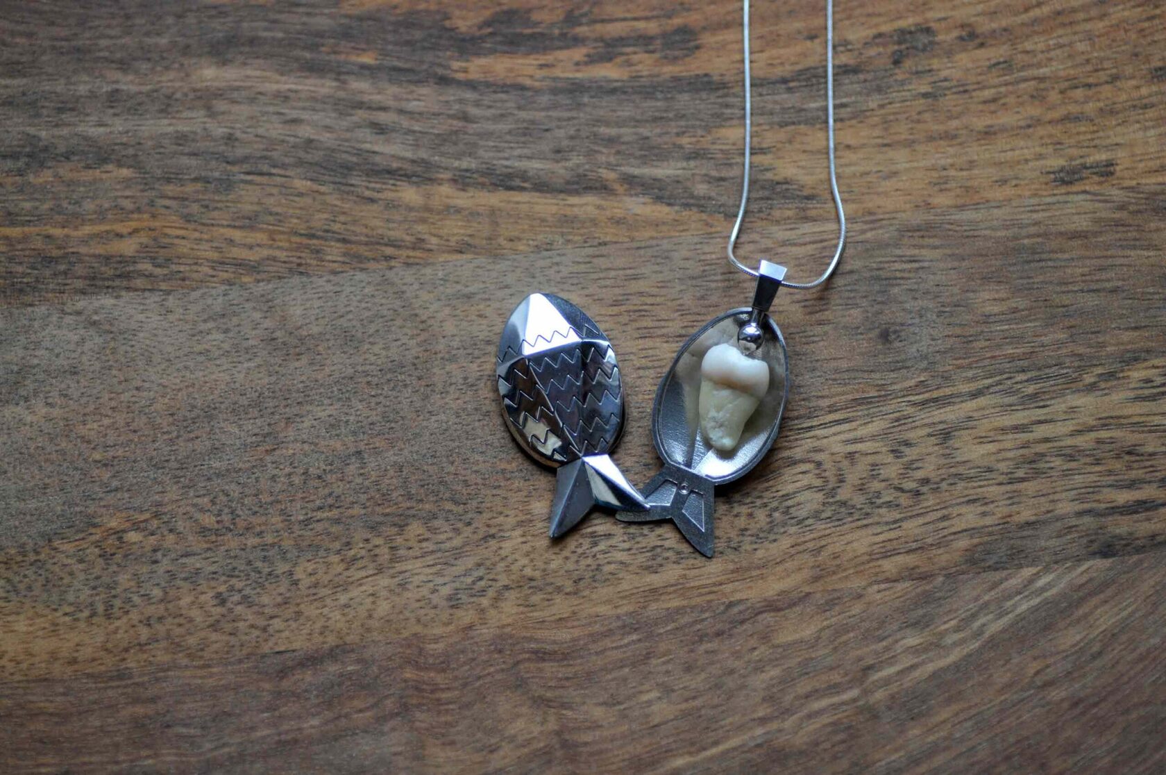 A woman asked me to create a pendant for her friend’s birthday. On one hand, she wanted thies pendant to incorporate her friend’s actual tooth that had been recently removed. On the other hand, she said her friend wasn’t punk enough to wear teeth as jewelry. So the task was to conceal the tooth. She said, her friend also loved geometric shapes and fishing – so as a result, I made a geometric fish-box that opens up, revealing the tooth pendant.