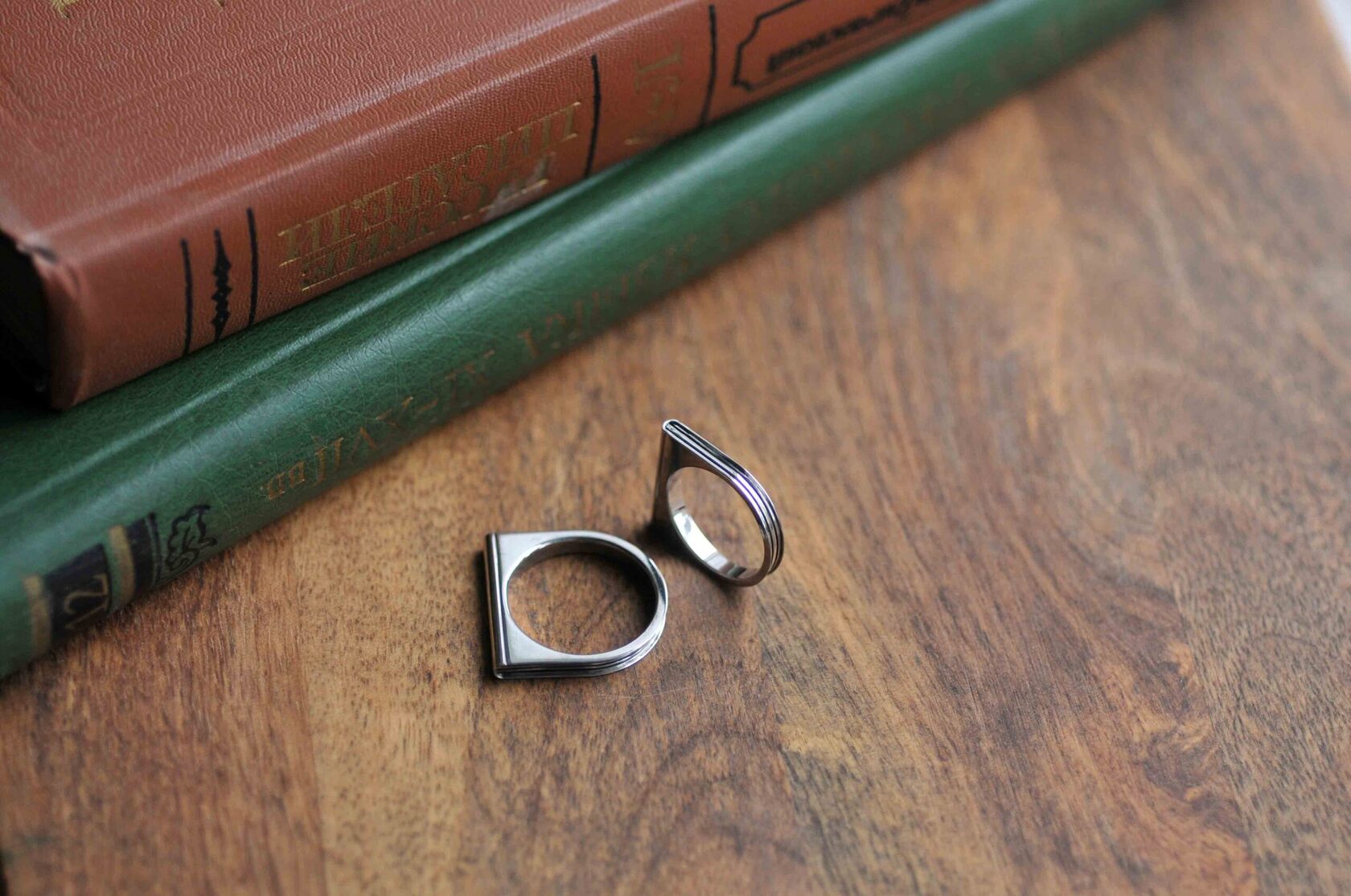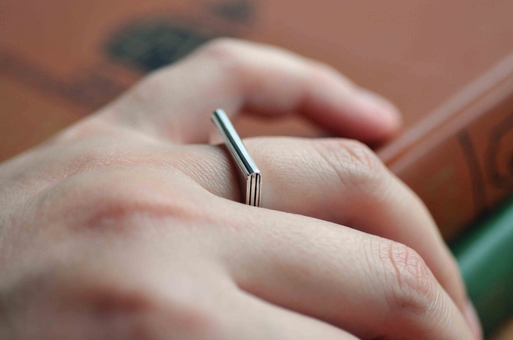 After several years of being happily married Olka and Shai wanted to update their wedding rings from more generic to something more personal. They asked me to make rings that would represent bookshelves of their personal libraries – when they first met and realized how many books they had in common, they knew it was meant to be. Their favorite animals are also present in these rings: as letters on some of the book spines.