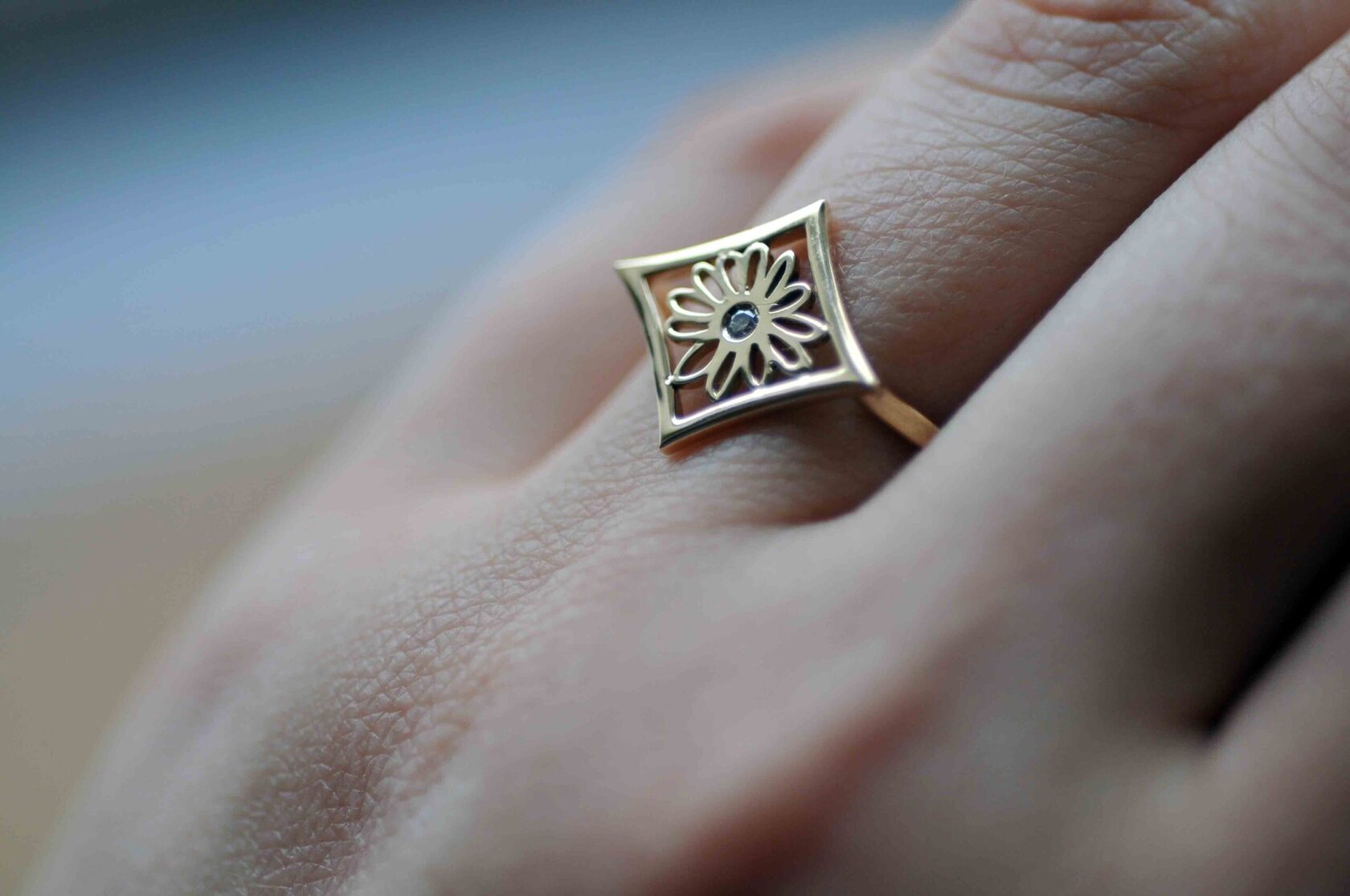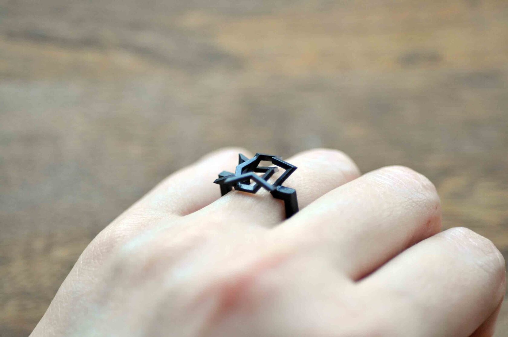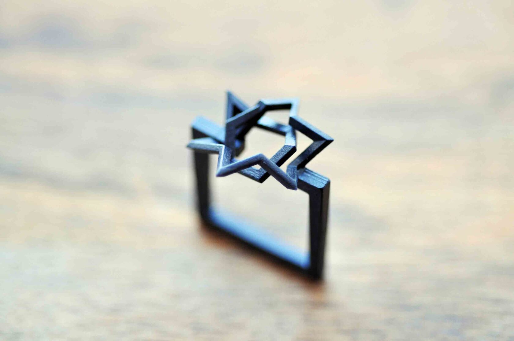 Liza asked me to create a ring with the Star of David sign, but she wanted it to have some sort of a twist. As a result, I created a ring with an optical illusion: when you look at the ring from the side it’s just an abstract structure made of lines with rectangular profiles, but when you look from the top the lines come together into a shape of a star.